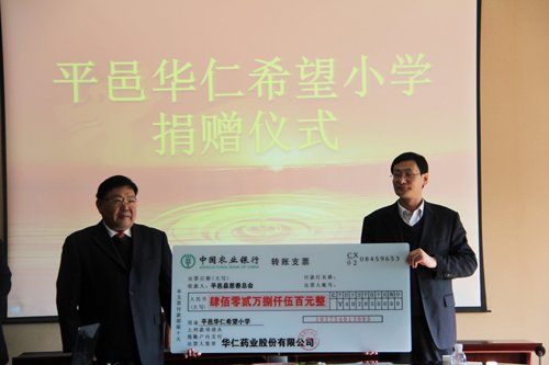 華仁藥業(yè)本次向平邑縣慈善總會(huì)捐贈(zèng)402.85萬元人民幣,用于平邑華仁希望小學(xué)的建設(shè)。在捐贈(zèng)儀式上,華仁藥業(yè)董事長(zhǎng)梁富友表示:“十年樹木,百年樹人。華仁藥業(yè)非常注重人才的培養(yǎng)、教育的發(fā)展。而學(xué)生是祖國(guó)的未來,我們有責(zé)任關(guān)心下一代的健康成長(zhǎng)。作為一家有社會(huì)責(zé)任感的民族醫(yī)藥企業(yè),在快速發(fā)展的同時(shí)始終堅(jiān)持回饋社會(huì),在健康醫(yī)療、支援災(zāi)區(qū)、教育事業(yè)等領(lǐng)域積極踐行社會(huì)責(zé)任,真正做到取之于社會(huì),反饋于社會(huì)。華仁藥業(yè)愿意為社會(huì)教育事業(yè)奉獻(xiàn)自己的一份力量?!?