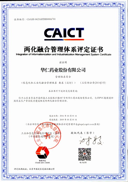 10月10日,公司以“非PVC腹膜透析液精益生產(chǎn)管控能力”通過國家兩化融合管理體系評定,獲得由國家工業(yè)和信息化部通信研究院頒發(fā)的《兩化融合管理體系評定》證書,這是公司智能制造綜合實(shí)力進(jìn)一步提升的象征。