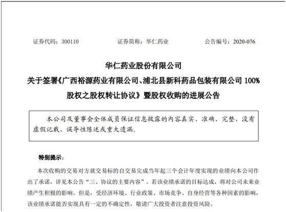 10月26日,華仁藥業(yè)還發(fā)布了《關(guān)于簽署<股權(quán)轉(zhuǎn)讓協(xié)議>暨股權(quán)收購(gòu)的進(jìn)展公告》,公司取得了實(shí)際控制人西安曲江新區(qū)管理委員會(huì)的核準(zhǔn)批復(fù),同意其收購(gòu)廣西裕源藥業(yè)有限公司、浦北縣新科藥品包裝有限公司100%股權(quán)。公司已經(jīng)與本次收購(gòu)交易對(duì)方簽署了正式的《股權(quán)轉(zhuǎn)讓協(xié)議》。